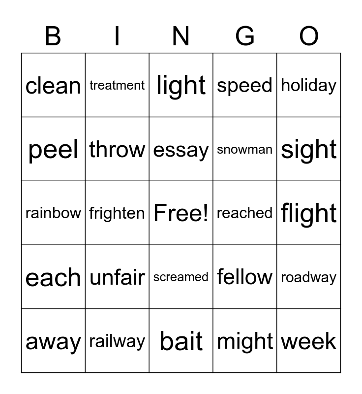 This bingo card has a free space and 24 words: unfair, railway, essay, away, holiday, clean, peel, treatment, reached, screamed, snowman, rainbow, fellow, roadway, throw, might, flight, light, sight, frighten, week, each, speed and bait.