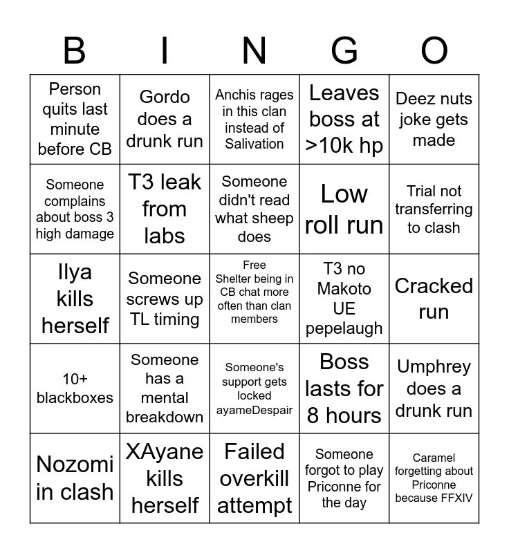This bingo card has a free space and 24 words: Someone has a mental breakdown, XAyane kills herself, Someone didn't read what sheep does, Nozomi in clash, Deez nuts joke gets made, Person quits last minute before CB, Someone complains about boss 3 high damage, Gordo does a drunk run, T3 no Makoto UE pepelaugh, Someone's support gets locked ayameDespair, Low roll run, Ilya kills herself, Boss lasts for 8 hours, Umphrey does a drunk run, T3 leak from labs, Someone forgot to play Priconne for the day, Cracked run, Anchis rages in this clan instead of Salivation, Trial not transferring to clash, Someone screws up TL timing, Caramel forgetting about Priconne because FFXIV, 10+ blackboxes, Leaves boss at >10k hp and Failed overkill attempt.