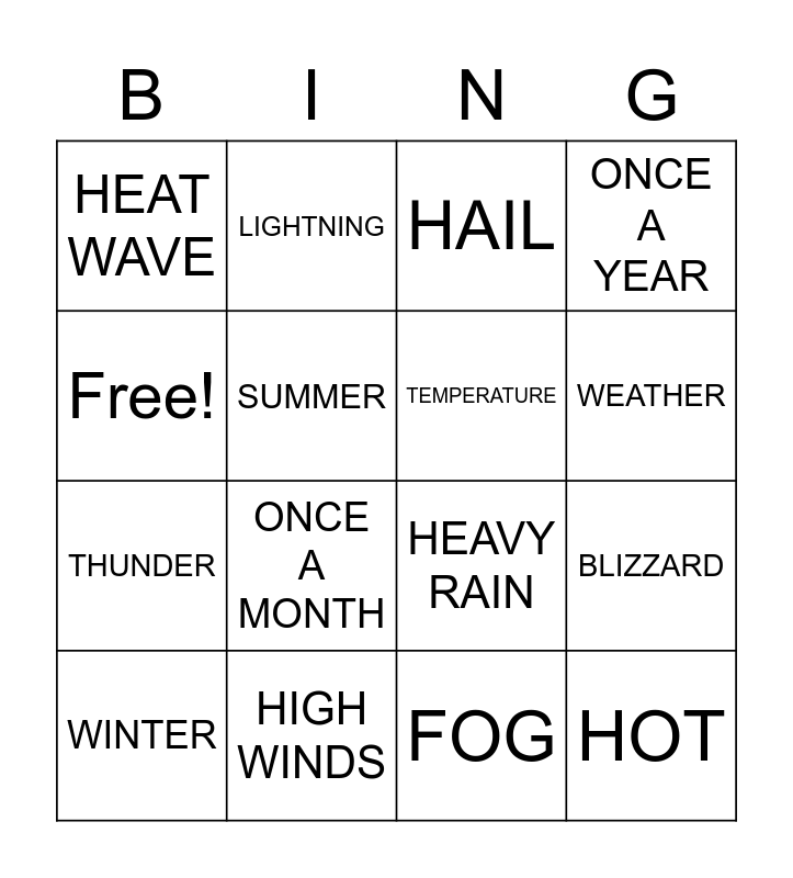 This bingo card has 16 words: HIGH WINDS, BLIZZARD, HAIL, HEAT WAVE, THUNDER, LIGHTNING, HEAVY RAIN, FOG, Free!, SUMMER, WINTER, ONCE A YEAR, ONCE A MONTH, WEATHER, TEMPERATURE and HOT.