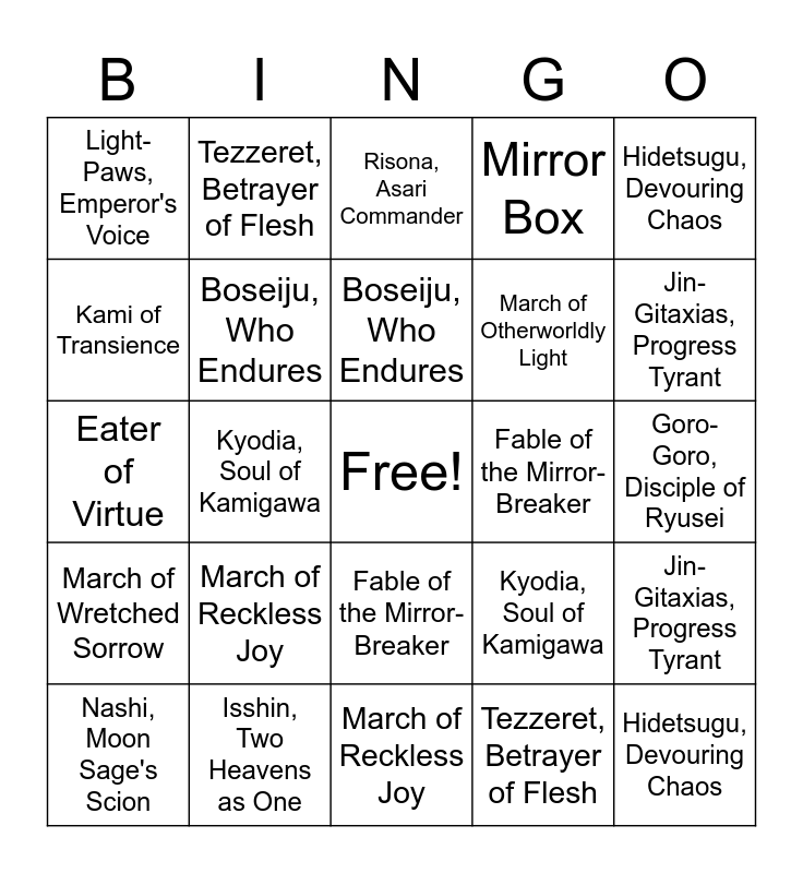 This bingo card has a free space and 63 words: Explosive Singularity Kodama of the West Tree Jin-Gitaxias, Progress Tyrant Nashi, Moon Sage's Scion Tamiyo, Compleated Sage Tezzeret, Betrayer of Flesh The Wandering Emperor Boseiju, Who Endures Eater of Virtue Fable of the Mirror-Breaker Farew, Explosive Singularity, Kodama of the West Tree, Jin-Gitaxias, Progress Tyrant, Nashi, Moon Sage's Scion, Tamiyo, Compleated Sage, Tezzeret, Betrayer of Flesh, The Wandering Emperor, Boseiju, Who Endures, Eater of Virtue, Fable of the Mirror-Breaker, Farewell, Goro-Goro, Disciple of Ryusei, Hidetsugu, Devouring Chaos, Isshin, Two Heavens as One, Kami of Transience, Kyodia, Soul of Kamigawa, Light-Paws, Emperor's Voice, Lizard Blades, March of Otherworldly Light, March of Reckless Joy, March of Wretched Sorrow, Mirror Box, Raiyuu, Storm's Edge, Risona, Asari Commander, Shigeki, Jukai Visionary, Sokenzan, Crucible of Defiance, Soul Transfer, Tameshi, Reality Architect, Tatsunari, Toad Rider, The Restoration of Eiganjo, Weaver of Harmony, Explosive Singularity, Kodama of the West Tree, Jin-Gitaxias, Progress Tyrant, Nashi, Moon Sage's Scion, Tamiyo, Compleated Sage, Tezzeret, Betrayer of Flesh, The Wandering Emperor, Boseiju, Who Endures, Eater of Virtue, Fable of the Mirror-Breaker, Farewell, Goro-Goro, Disciple of Ryusei, Hidetsugu, Devouring Chaos, Isshin, Two Heavens as One, Kami of Transience, Kyodia, Soul of Kamigawa, Light-Paws, Emperor's Voice, Lizard Blades, March of Otherworldly Light, March of Reckless Joy, March of Wretched Sorrow, Mirror Box, Raiyuu, Storm's Edge, Risona, Asari Commander, Shigeki, Jukai Visionary, Sokenzan, Crucible of Defiance, Soul Transfer, Tameshi, Reality Architect, Tatsunari, Toad Rider, The Restoration of Eiganjo and Weaver of Harmony.