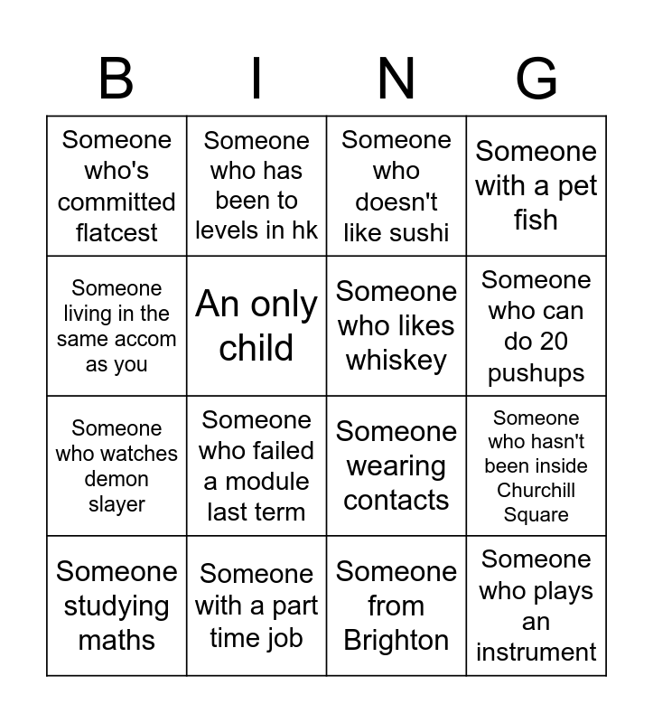 This bingo card has 16 words: Someone with a part time job, Someone who hasn't been inside Churchill Square, Someone who doesn't like sushi, Someone who's committed flatcest, Someone who watches demon slayer, Someone who has been to levels in hk, Someone wearing contacts, Someone from Brighton, Someone living in the same accom as you, An only child, Someone studying maths, Someone with a pet fish, Someone who failed a module last term, Someone who can do 20 pushups, Someone who likes whiskey and Someone who plays an instrument.