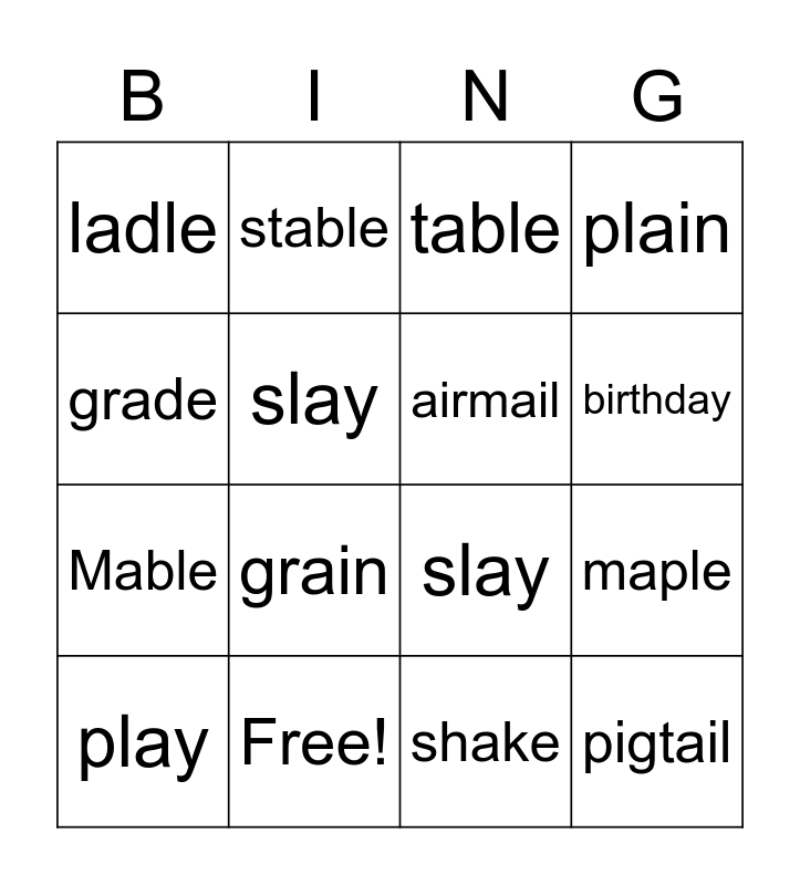 This bingo card has 16 words: Free!, maple, table, ladle, Mable, stable, slay, shake, grade, slay, play, plain, grain, birthday, airmail and pigtail.