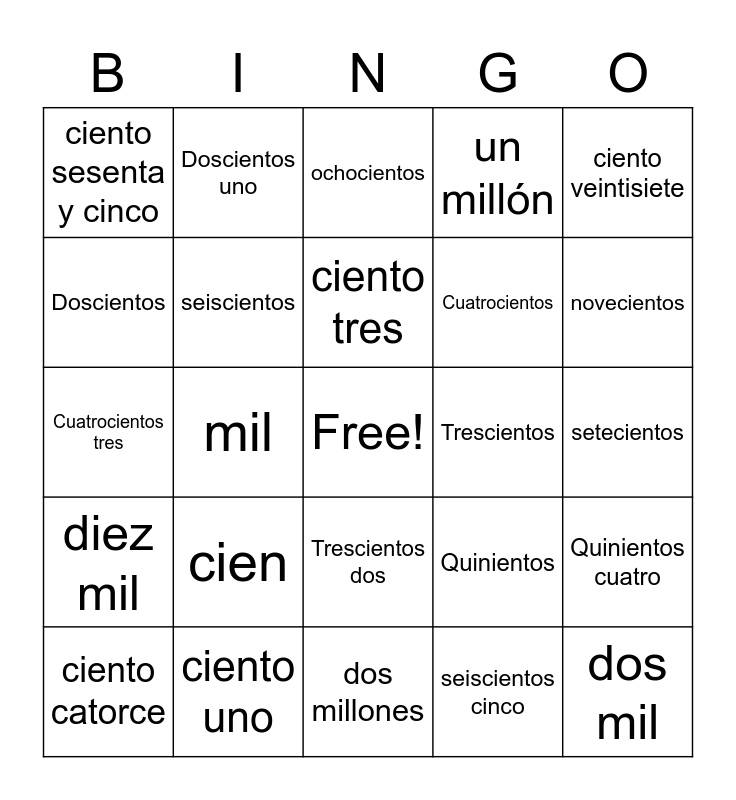 This bingo card has a free space and 24 words: cien, ciento uno, ciento tres, ciento catorce, ciento veintisiete, ciento sesenta y cinco, Doscientos, Doscientos uno, Trescientos, Trescientos dos, Cuatrocientos, Cuatrocientos tres, Quinientos, Quinientos cuatro, seiscientos, seiscientos cinco, setecientos, ochocientos, novecientos, mil, dos mil, diez mil, un millón and dos millones.