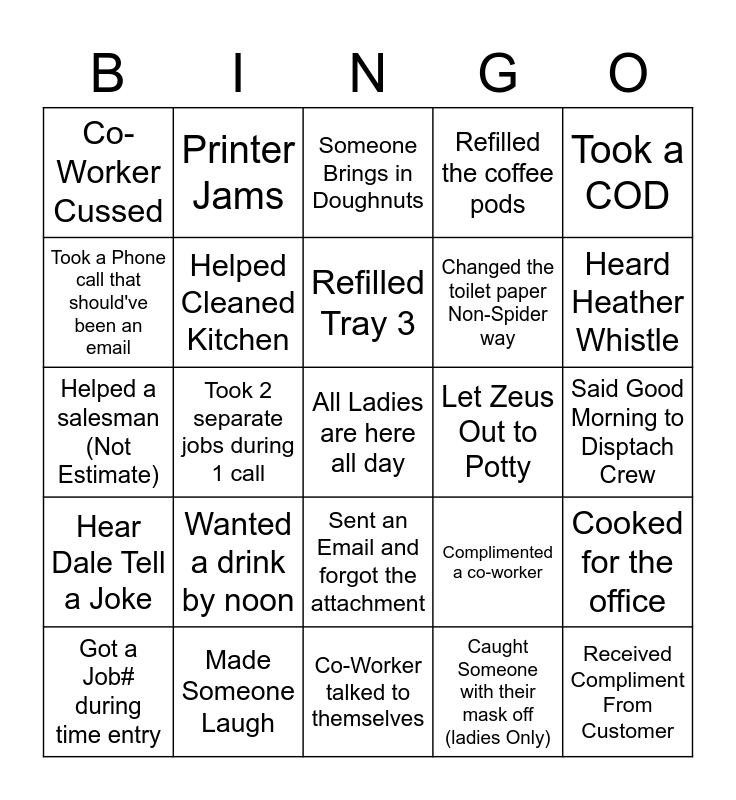 This bingo card has a free space and 24 words: Wanted a drink by noon, Made Someone Laugh, Refilled Tray 3, Got a Job# during time entry, Took a COD, Co- Worker Cussed, Took a Phone call that should've been an email, Printer Jams, Let Zeus Out to Potty, Sent an Email and forgot the attachment, Changed the toilet paper Non-Spider way, Helped a salesman (Not Estimate), Complimented a co-worker, Cooked for the office, Helped Cleaned Kitchen, Caught Someone with their mask off (ladies Only), Said Good Morning to Disptach Crew, Someone Brings in Doughnuts, Heard Heather Whistle, Took 2 separate jobs during 1 call, Received Compliment From Customer, Hear Dale Tell a Joke, Refilled the coffee pods and Co-Worker talked to themselves.