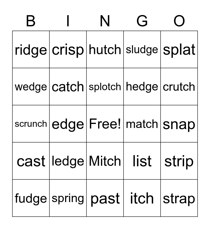 This bingo card has a free space and 29 words: fudge, scratch, edge, clutch, ridge, hutch, catch, ledge, match, spring, snap, strap, past, itch, crutch, pledge, Mitch, cast, splat, scrunch, list, dredge, hedge, wedge, sludge, crisp, strip, splotch and crunch.