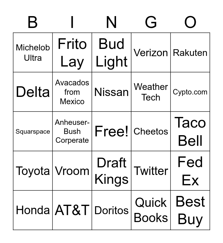 This bingo card has a free space and 30 words: AT&T, Bush Beer, Anheuser-Bush Corperate, Sams Club, Michelob Ultra, Bud Light, Avacados from Mexico, Draft Kings, Cheetos, Doritos, Taco Bell, Best Buy, Quick Books, FTX Cypto, Cypto.com, Turbo Tax, Twitter, Toyota, Vroom, Rakuten, Squarspace, Meta, Frito Lay, Weather Tech, Delta, Verizon, Fed Ex, Honda, Nissan and Pringles.