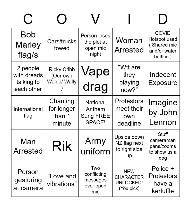 This bingo card has a free space and 28 words: Stuff cameraman pans/zooms to show us a dog, Natural immunity sign unattended or missing, "Wtf are they playing now?", NEW CHARACTER UNLOCKED! (You pick), 2 people with dreads talking to each other, Person loses the plot at open mic night, Cars/trucks towed, Man Arrested, Protestors meet their own deadline, Person gesturing at camera, International flag, Woman Arrested, "Love and vibrations", Two conflicting messages over open mic, Indecent Exposure, Illegible sign, Rik, Ricky Cribb (Our own Waldo/ Wally ), Vape drag, Army uniform, Bob Marley flag/s, 2 matching umbrellas next to each other! (excl. plain black), Police + Protestors have a kerfuffle, Chanting for longer than 1 minute, Imagine by John Lennon, Upside down NZ flag next to right side up, COVID Hotspot used ( Shared mic and/or water bottles ) and Cultural appropriation.