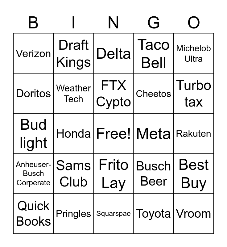 This bingo card has a free space and 30 words: Pringles, Nissan, Honda, Fed Ex, Verizon, Delta, Weather Tech, Frito Lay, Meta, Squarspae, Rakuten, Vroom, Toyota, Twitter, Turbo tax, AT&T, Busch Beer, Anheuser-Busch Corperate, Sams Club, Michelob Ultra, Bud light, Avacados from Mexico, Draft Kings, Cheetos, Doritos, Taco Bell, Best Buy, Quick Books, FTX Cypto and Cypto.com.