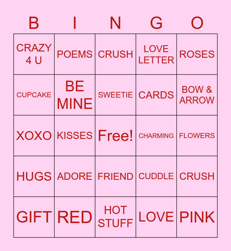 This bingo card has a free space and 32 words: LOVE, HEART, KISSES, CUPID, HUGS, BE MINE, ROSES, CRUSH, POEMS, CHOCOLATE, SWEETIE, CRUSH, ADMIRER, ROMANCE, CHARMING, DATE, GIFT, XOXO, FRIEND, ADORE, CUDDLE, FLIRT, FLOWERS, RED, PINK, LOVE LETTER, CARDS, CUPCAKE, CRAZY 4 U, HOT STUFF, BE COOL and BOW & ARROW.