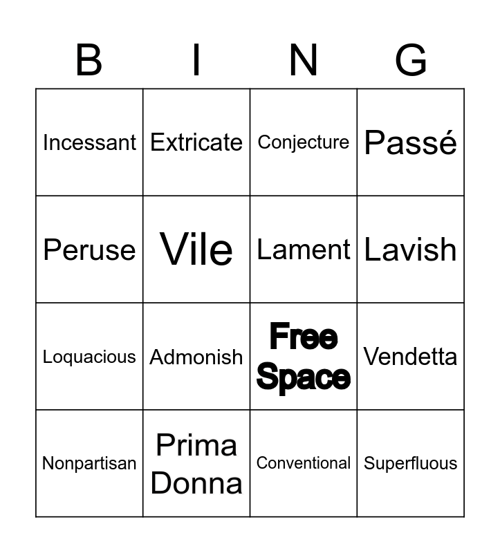 This bingo card has 16 words: Prima Donna, Vendetta, Conjecture, Incessant, Loquacious, Extricate, Free Space, Conventional, Peruse, Vile, Nonpartisan, Passé, Admonish, Lavish, Lament and Superfluous.