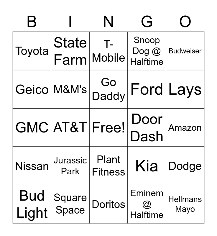 This bingo card has a free space and 25 words: Jurassic Park, Doritos, Go Daddy, Bud Light, Budweiser, Toyota, Geico, State Farm, Door Dash, Plant Fitness, Ford, GMC, Kia, Dodge, M&M's, Hero/Veteran, Amazon, T-Mobile, Lays, AT&T, Hellmans Mayo, Square Space, Nissan, Snoop Dog @ Halftime and Eminem @ Halftime.
