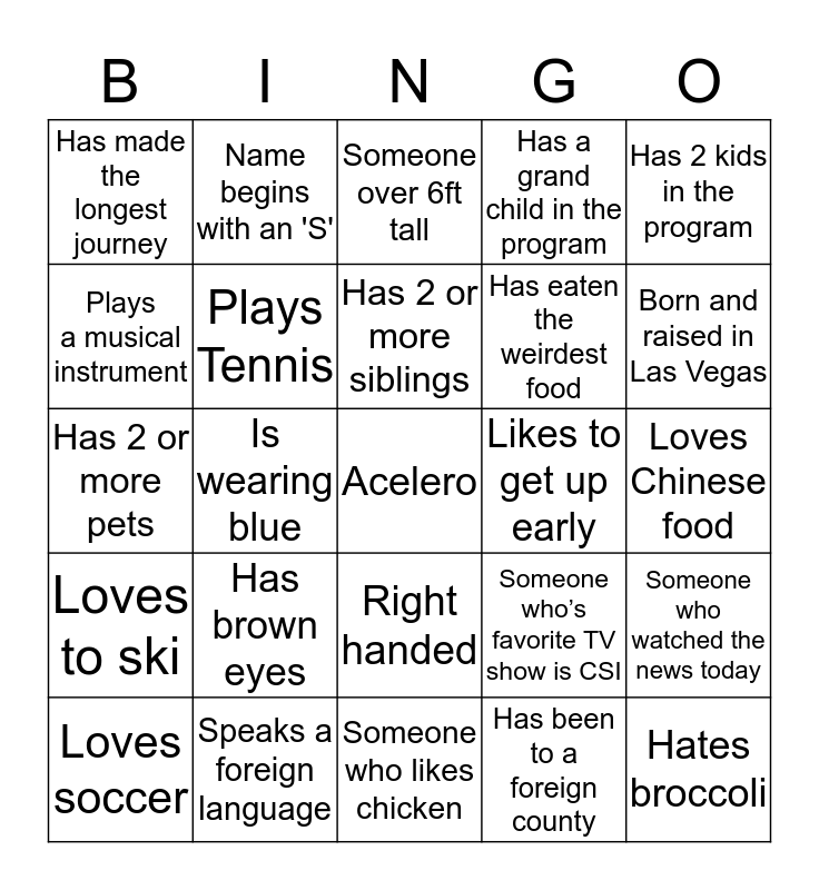 This bingo card has a free space and 24 words: Has brown eyes, Speaks a foreign language, Has 2 or more siblings, Loves soccer, Has 2 kids in the program, Has made the longest journey, Plays a musical instrument, Name begins with an 'S', Likes to get up early, Right handed, Has eaten the weirdest food, Has 2 or more pets, Someone who’s favorite TV show is CSI, Someone who watched the news today, Plays Tennis, Has been to a foreign county, Loves Chinese food, Someone over 6ft tall, Born and raised in Las Vegas, Is wearing blue, Hates broccoli, Loves to ski, Has a grand child in the program and Someone who likes chicken.