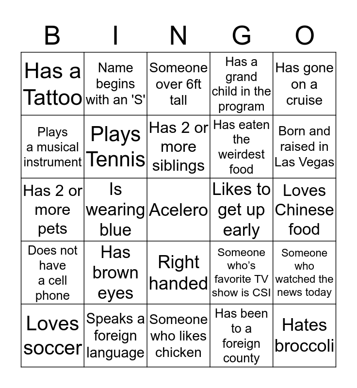 This bingo card has a free space and 24 words: Has brown eyes, Speaks a foreign language, Has 2 or more siblings, Loves soccer, Has gone on a cruise, Has a Tattoo, Plays a musical instrument, Name begins with an 'S', Likes to get up early, Right handed, Has eaten the weirdest food, Has 2 or more pets, Someone who’s favorite TV show is CSI, Someone who watched the news today, Plays Tennis, Has been to a foreign county, Loves Chinese food, Someone over 6ft tall, Born and raised in Las Vegas, Is wearing blue, Hates broccoli, Does not have a cell phone, Has a grand child in the program and Someone who likes chicken.