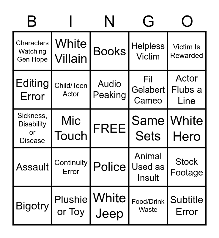 This bingo card has a free space and 24 words: Continuity Error, Plushie or Toy, Audio Peaking, Bigotry, Victim Is Rewarded, Characters Watching Gen Hope, Editing Error, White Villain, Same Sets, Police, Fil Gelabert Cameo, Sickness, Disability or Disease, Animal Used as Insult, Stock Footage, Child/Teen Actor, Food/Drink Waste, White Hero, Books, Actor Flubs a Line, Mic Touch, Subtitle Error, Assault, Helpless Victim and White Jeep.