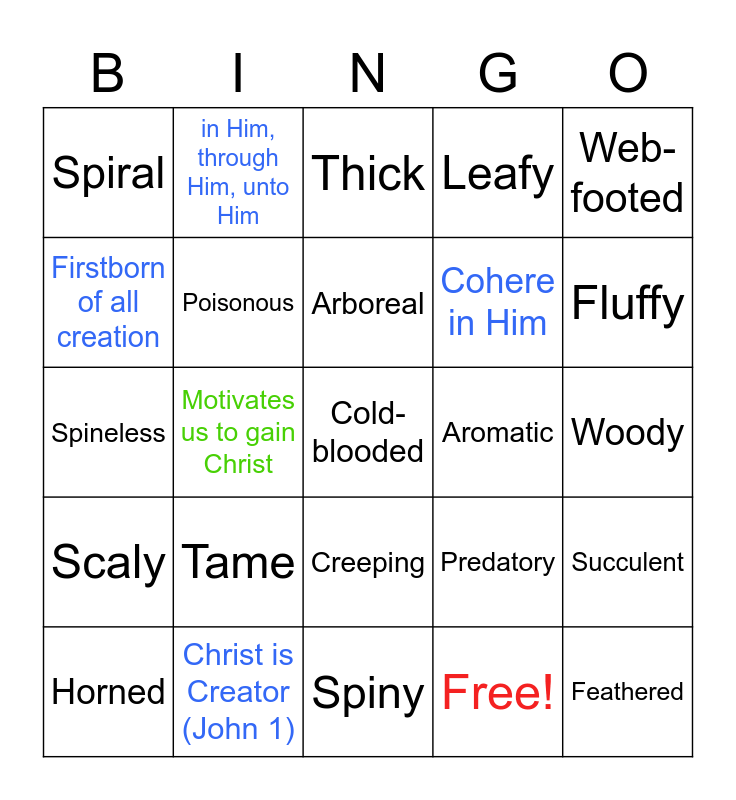 This bingo card has 30 words: Christ is Creator (John 1), Uphold all things, Motivates us to gain Christ, Hairy, Spiral, Thick, Poisonous, Creeping, Aromatic, Spiny, Woody, Cold-blooded, Free!, Feathered, Fluffy, Migratory, Predatory, Scaly, Tame, Web-footed, Spineless, Nocturnal, in Him, through Him, unto Him, Cohere in Him, Firstborn of all creation, Leafy, Succulent, Horned, Arboreal and Amphibious.
