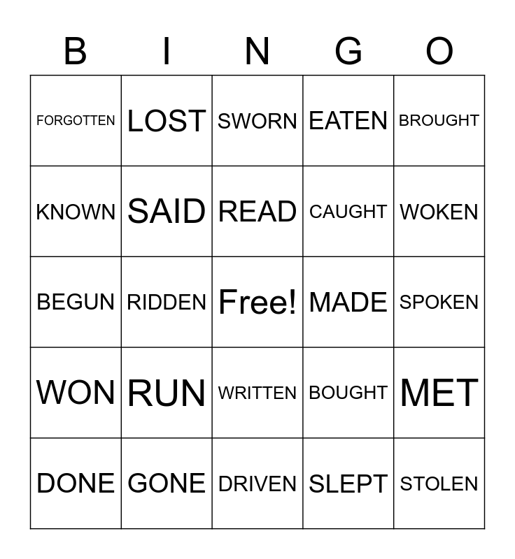 This bingo card has a free space and 24 words: RUN, GONE, READ, DONE, BROUGHT, FORGOTTEN, KNOWN, LOST, MADE, WRITTEN, CAUGHT, BEGUN, BOUGHT, MET, SAID, SLEPT, SPOKEN, SWORN, WOKEN, RIDDEN, STOLEN, WON, EATEN and DRIVEN.