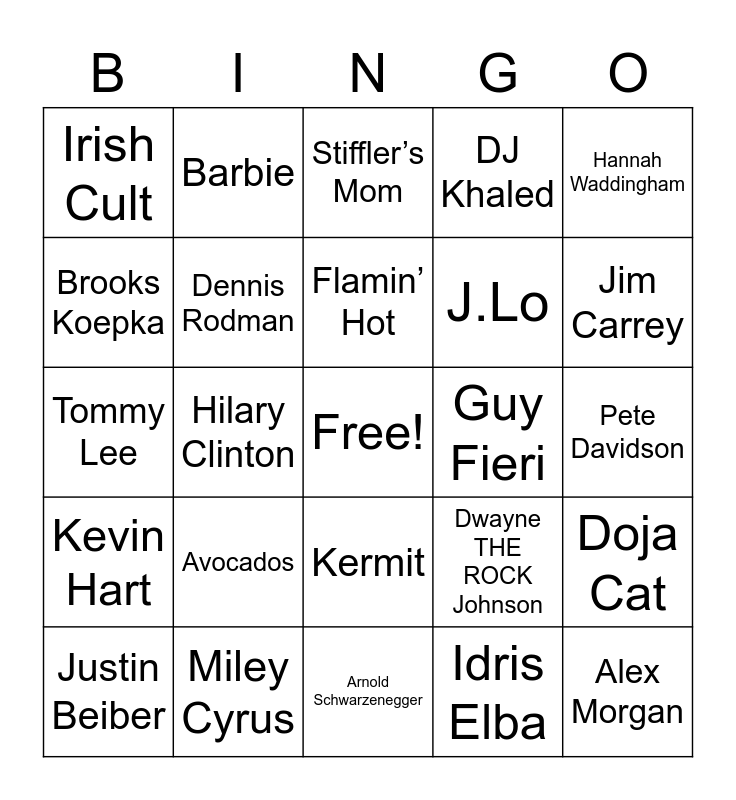 This bingo card has a free space and 48 words: “My Precious”, Alex Morgan, Andy Richter, Arnold Schwarzenegger, Avocados, Baby Me, Barbie, Batman, Brooks Koepka, Clydesdale, Dennis Rodman, DJ Khaled, Doja Cat, Dwayne THE ROCK Johnson, Eugene Levy, Ewan McGregor, Flamin’ Hot, Guy Fieri, Halle Berry, Hannah Waddingham, Hilary Clinton, Idris Elba, Irish Cult, J.Lo, Jason Sudeikis, Jim Carrey, Justin Beiber, Katy Perry, Kermit, Kevin Hart, Kim Kardashian, Lizzo, Matt Damon, Megan Thee Stalion, Miley Cyrus, Morgan Freeman, Paul Rudd, Pete Davidson, Pringles, Robo Dog, Scarlett and Colin, Steve Buscemi, Stiffler’s Mom, The Fresh Prince, Tommy Lee, Vroom, WeatherTech and Zendaya.