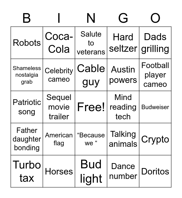 This bingo card has a free space and 25 words: American flag, Bud light, Cable guy, Turbo tax, Dads grilling, Robots, Shameless nostalgia grab, Coca-Cola, Mind reading tech, “Because we “, Austin powers, Patriotic song, Talking animals, Crypto, Celebrity cameo, Electric car, Budweiser, Salute to veterans, Football player cameo, Sequel movie trailer, Doritos, Horses, Father daughter bonding, Hard seltzer and Dance number.