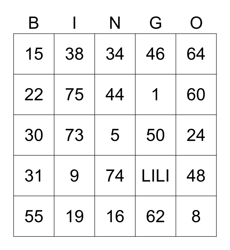 This bingo card has 25 words: 9, 16, 44, 55, 64, 15, 22, 38, 50, 74, 1, 30, LILI, 48, 75, 8, 24, 34, 60, 73, 5, 19, 31, 46 and 62.