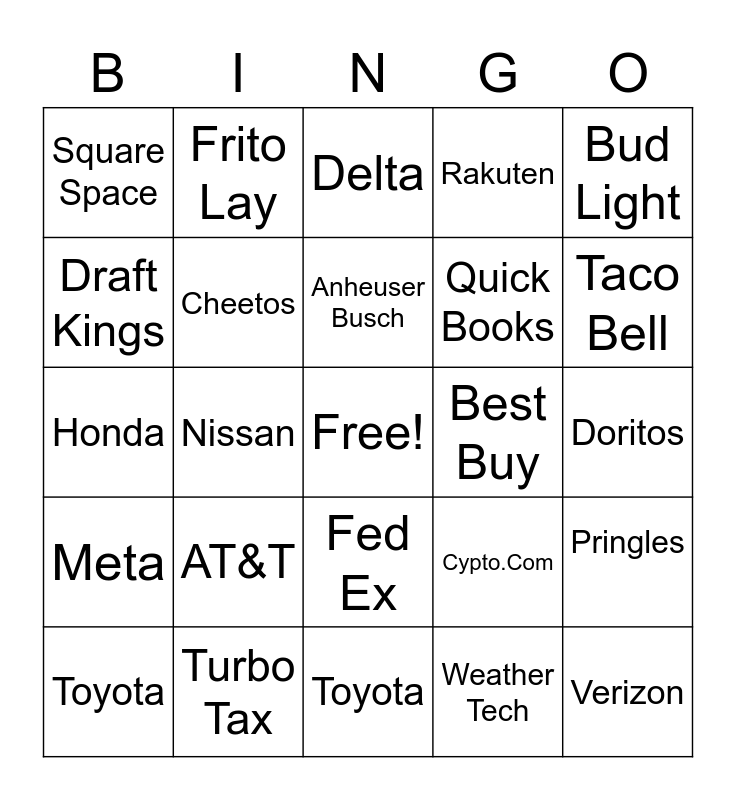 This bingo card has a free space and 24 words: AT&T, Turbo Tax, Anheuser Busch, Toyota, Bud Light, Square Space, Draft Kings, Frito Lay, Best Buy, Fed Ex, Quick Books, Honda, Cypto.Com, Pringles, Cheetos, Weather Tech, Doritos, Delta, Taco Bell, Nissan, Verizon, Meta, Rakuten and Toyota.