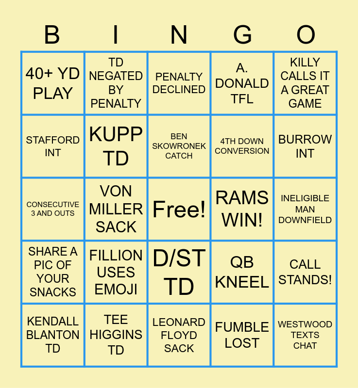 This bingo card has a free space and 24 words: FILLION USES EMOJI, TEE HIGGINS TD, BEN SKOWRONEK CATCH, KENDALL BLANTON TD, KILLY CALLS IT A GREAT GAME, 40+ YD PLAY, STAFFORD INT, TD NEGATED BY PENALTY, RAMS WIN!, D/ST TD, 4TH DOWN CONVERSION, CONSECUTIVE 3 AND OUTS, QB KNEEL, CALL STANDS!, KUPP TD, FUMBLE LOST, INELIGIBLE MAN DOWNFIELD, PENALTY DECLINED, BURROW INT, VON MILLER SACK, WESTWOOD TEXTS CHAT, SHARE A PIC OF YOUR SNACKS, A. DONALD TFL and LEONARD FLOYD SACK.