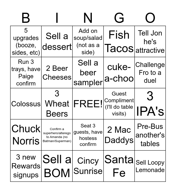 This bingo card has a free space and 24 words: Confirm a superhero/alterego to Amanda (no Batman/Superman), Sell a BOM, Sell a beer sampler, 3 new Rewards signups, Tell Jon he's attractive, 5 upgrades (booze, sides, etc), Run 3 trays, have Paige confirm, Sell a dessert, Guest Compliment (I'll do table visits), Seat 3 guests, have hostess confirm, cuke-a-choo, Colossus, 2 Mac Daddys, Pre-Bus another's tables, 2 Beer Cheeses, Santa Fe, 3 IPA's, Add on soup/salad (not as a side), Challenge Fro to a duel, 3 Wheat Beers, Sell Loopy Lemonade, Chuck Norris, Fish Tacos and Cincy Sunrise.
