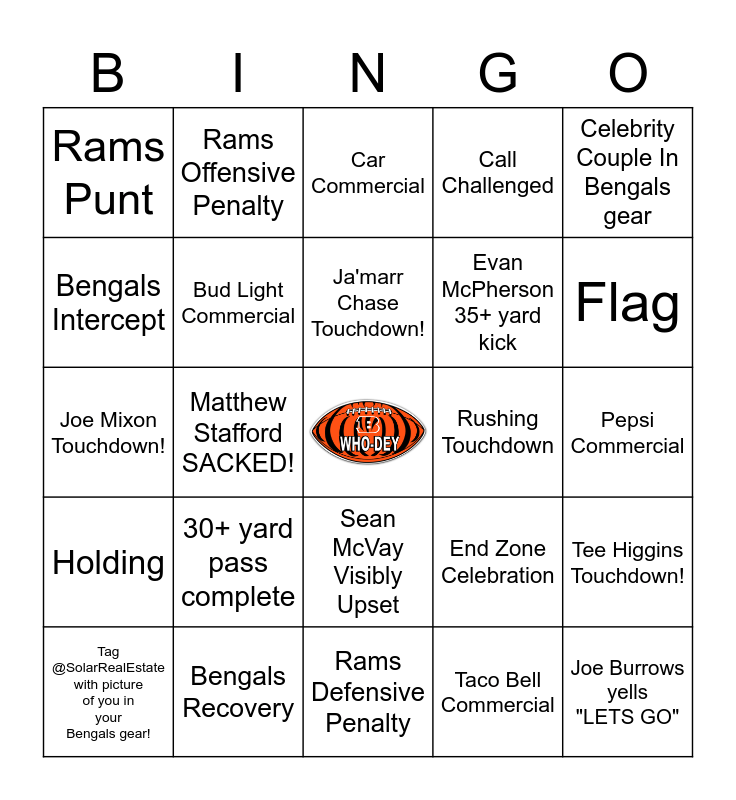 This bingo card has a free space and 24 words: 30+ yard pass complete, Bengals Recovery, Ja'marr Chase Touchdown!, Tag @SolarRealEstate with picture of you in your Bengals gear!, Celebrity Couple In Bengals gear, Rams Punt, Bengals Intercept, Rams Offensive Penalty, Rushing Touchdown, Sean McVay Visibly Upset, Evan McPherson 35+ yard kick, Joe Mixon Touchdown!, End Zone Celebration, Tee Higgins Touchdown!, Bud Light Commercial, Taco Bell Commercial, Pepsi Commercial, Car Commercial, Flag, Matthew Stafford SACKED!, Joe Burrows yells "LETS GO", Holding, Call Challenged and Rams Defensive Penalty.