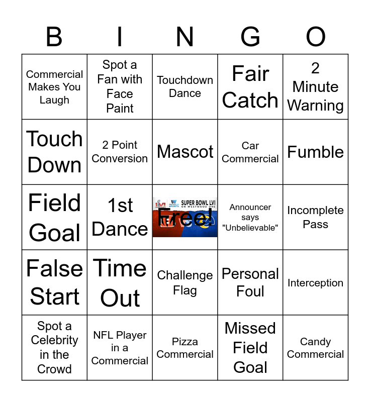 This bingo card has a free space and 24 words: Time Out, NFL Player in a Commercial, Mascot, Spot a Celebrity in the Crowd, 2 Minute Warning, Commercial Makes You Laugh, Touch Down, Spot a Fan with Face Paint, Announcer says "Unbelievable", Challenge Flag, Car Commercial, Field Goal, Personal Foul, Interception, 2 Point Conversion, Missed Field Goal, Incomplete Pass, Touchdown Dance, Fumble, 1st Dance, Candy Commercial, False Start, Fair Catch and Pizza Commercial.