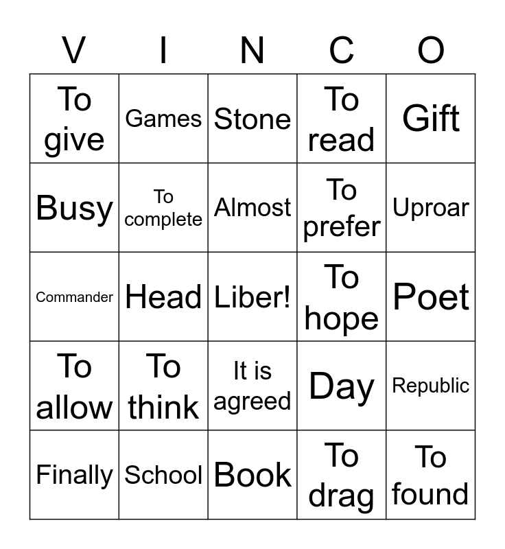 This bingo card has a free space and 24 words: To think, School, Almost, Finally, Gift, To give, Busy, Games, To hope, It is agreed, To prefer, Commander, Day, Republic, To complete, To drag, Poet, Stone, Uproar, Head, To found, To allow, To read and Book.