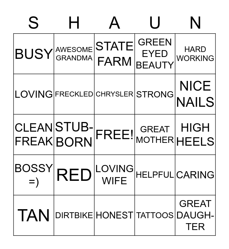 This bingo card has a free space and 24 words: RED, DIRTBIKE, CHRYSLER, TAN, HARD WORKING, BUSY, LOVING, AWESOME GRANDMA, GREAT MOTHER, LOVING WIFE, STRONG, CLEAN FREAK, HELPFUL, CARING, FRECKLED, TATTOOS, HIGH HEELS, STATE FARM, NICE NAILS, STUB-BORN, GREAT DAUGH-TER, BOSSY =), GREEN EYED BEAUTY and HONEST.