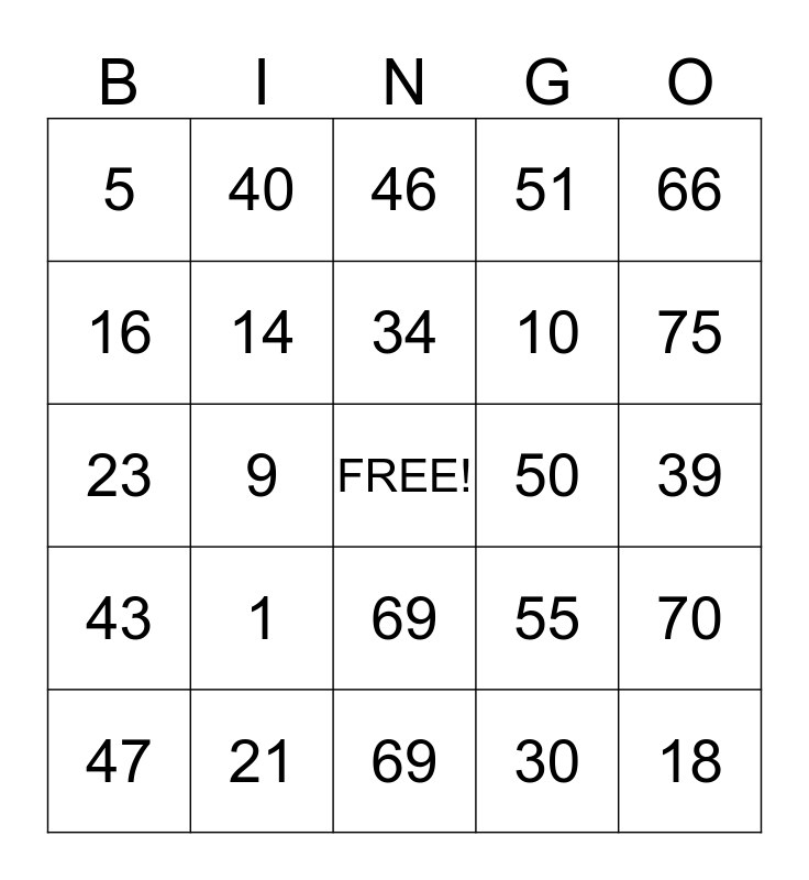 This bingo card has a free space and 24 words: 1, 21, 34, 47, 66, 5, 16, 40, 50, 69, 10, 23, 55, 70, 14, 30, 39, 46, 75, 9, 18, 43, 51 and 69.