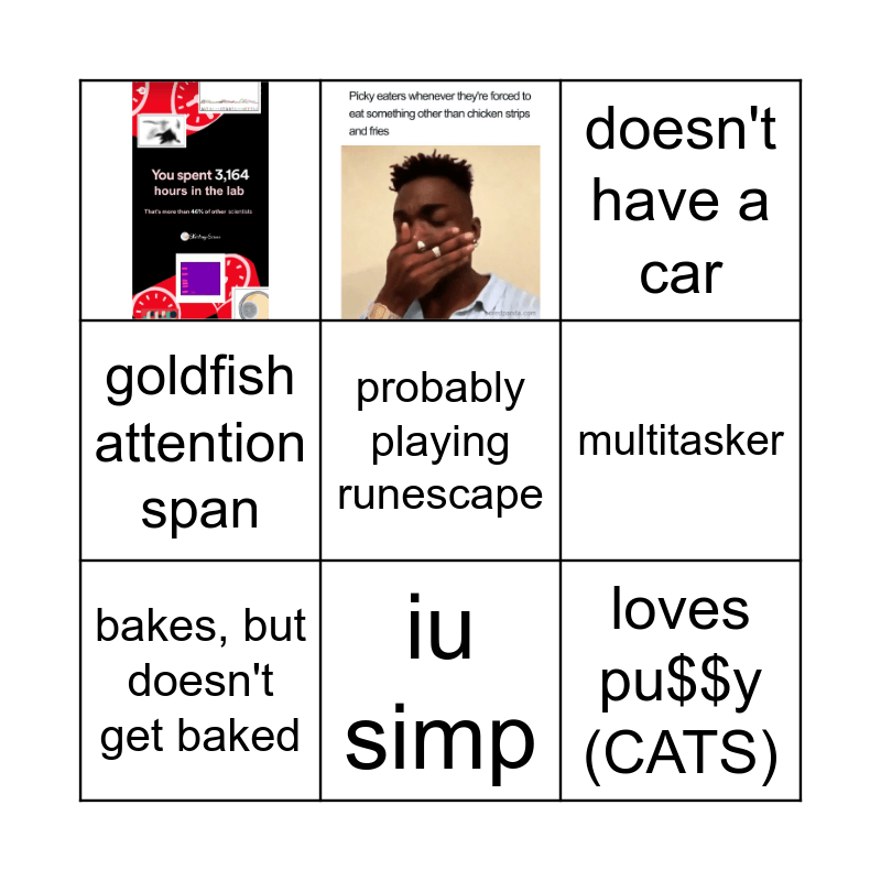 This bingo card has 2 images, a free space and 6 words: multitasker, doesn't have a car, bakes, but doesn't get baked, loves pu$$y (CATS), goldfish attention span and iu simp.