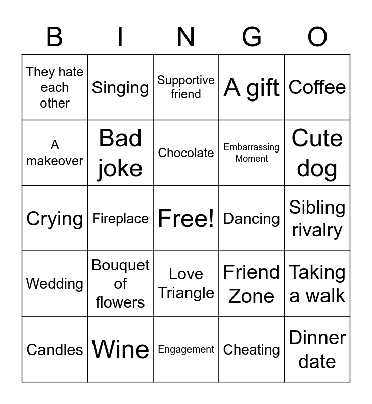 This bingo card has a free space and 24 words: Bouquet of flowers, Wine, Chocolate, Candles, Coffee, They hate each other, A makeover, Singing, Dancing, Love Triangle, Embarrassing Moment, Crying, Friend Zone, Taking a walk, Bad joke, Cheating, Sibling rivalry, Supportive friend, Cute dog, Fireplace, Dinner date, Wedding, A gift and Engagement.