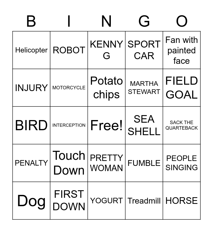 This bingo card has a free space and 24 words: Dog, Touch Down, Potato chips, Treadmill, Fan with painted face, Helicopter, ROBOT, KENNY G, SEA SHELL, SACK THE QUARTEBACK, BIRD, MOTORCYCLE, FUMBLE, PEOPLE SINGING, INJURY, FIRST DOWN, YOGURT, SPORT CAR, FIELD GOAL, PENALTY, INTERCEPTION, PRETTY WOMAN, MARTHA STEWART and HORSE.