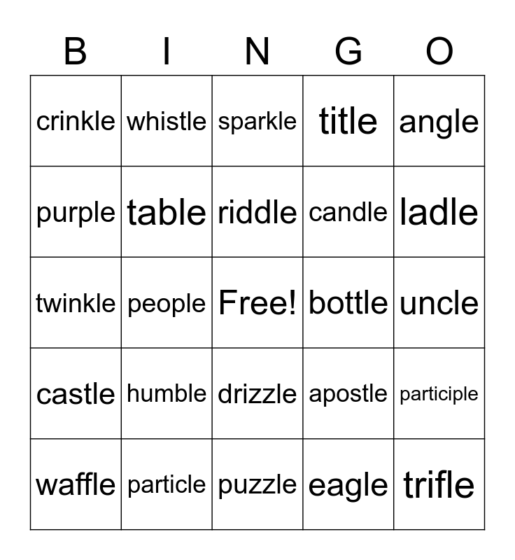 This bingo card has a free space and 24 words: humble, particle, riddle, waffle, angle, crinkle, purple, whistle, bottle, drizzle, candle, twinkle, apostle, participle, table, eagle, uncle, sparkle, ladle, people, trifle, castle, title and puzzle.