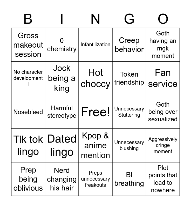 This bingo card has a free space and 30 words: Nerd changing his hair, kawaii noises, Harmful stereotype, Prep getting drunk, Gross makeout session, Infantilization, Jock being a king, Kpop & anime mention, Unnecessary Stuttering, Preps unnecessary freakouts, Goth being over sexualized, Plot points that lead to nowhere, Bl breathing, Bad dialogue, Fan service, Bad flirting, Unnecessary blushing, Tik tok lingo, Dated lingo, Goth having an mgk moment, Nosebleed, Nerd obviously being a self insert, 0 chemistry, Token friendship, No character development l, Creep behavior, Aggressively cringe moment, Prep being oblivious, Hot choccy and Whining over things w easy solutions.