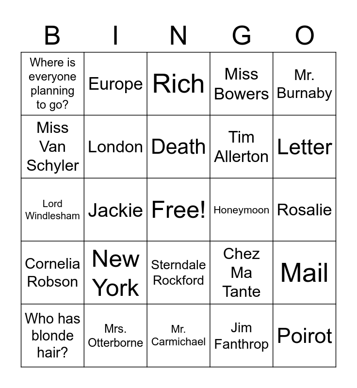 This bingo card has a free space and 29 words: Who has blonde hair?, Joanna, Jackie, Simon Doyle, Where is everyone planning to go?, Rich, London, New York, Honeymoon, Mrs. Otterborne, Rosalie, Poirot, Mr. Carmichael, Jim Fanthrop, Letter, Andrew Pennington, Sterndale Rockford, Cornelia Robson, Mr. Burnaby, Lord Windlesham, Chez Ma Tante, Wode, Tim Allerton, Miss Van Schyler, Miss Bowers, Europe, Mail, Death and Nile.
