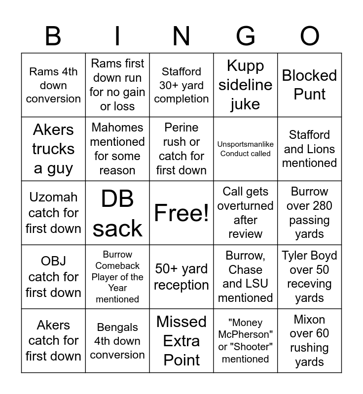 This bingo card has a free space and 24 words: Burrow Comeback Player of the Year mentioned, Bengals 4th down conversion, Perine rush or catch for first down, Akers catch for first down, Blocked Punt, Rams 4th down conversion, Akers trucks a guy, Rams first down run for no gain or loss, Call gets overturned after review, 50+ yard reception, Unsportsmanlike Conduct called, Uzomah catch for first down, Burrow, Chase and LSU mentioned, Tyler Boyd over 50 receving yards, Mahomes mentioned for some reason, "Money McPherson" or "Shooter" mentioned, Burrow over 280 passing yards, Stafford 30+ yard completion, Stafford and Lions mentioned, DB sack, Mixon over 60 rushing yards, OBJ catch for first down, Kupp sideline juke and Missed Extra Point.