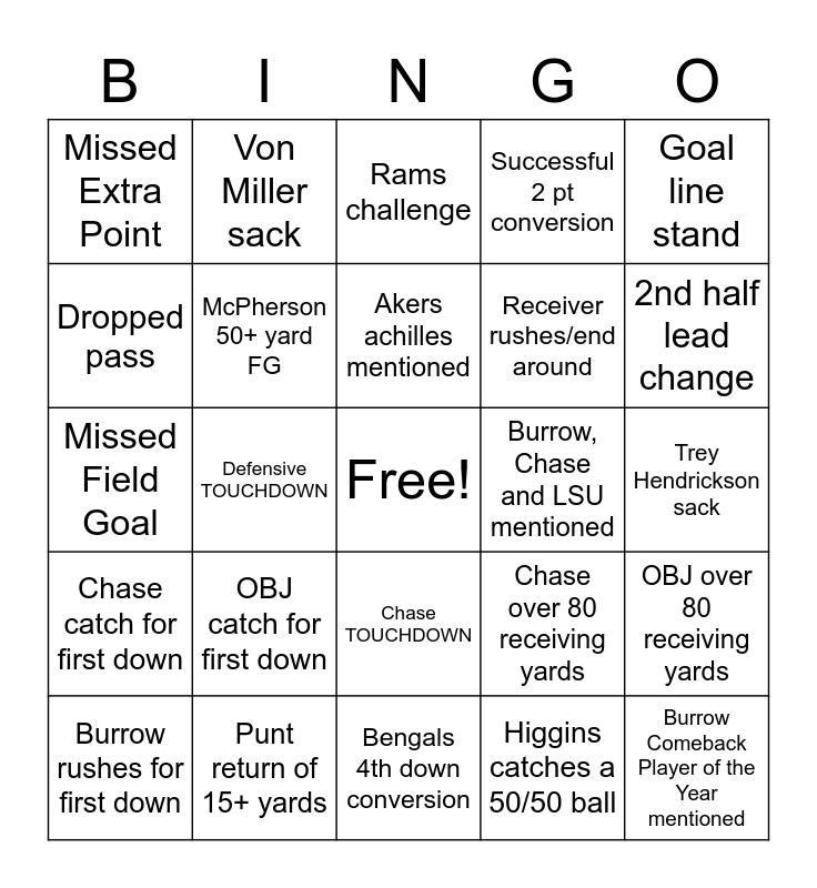 This bingo card has a free space and 24 words: OBJ catch for first down, Punt return of 15+ yards, Akers achilles mentioned, Burrow rushes for first down, Goal line stand, Missed Extra Point, Dropped pass, Von Miller sack, Burrow, Chase and LSU mentioned, Chase TOUCHDOWN, Receiver rushes/end around, Missed Field Goal, Chase over 80 receiving yards, OBJ over 80 receiving yards, McPherson 50+ yard FG, Higgins catches a 50/50 ball, Trey Hendrickson sack, Rams challenge, 2nd half lead change, Defensive TOUCHDOWN, Burrow Comeback Player of the Year mentioned, Chase catch for first down, Successful 2 pt conversion and Bengals 4th down conversion.