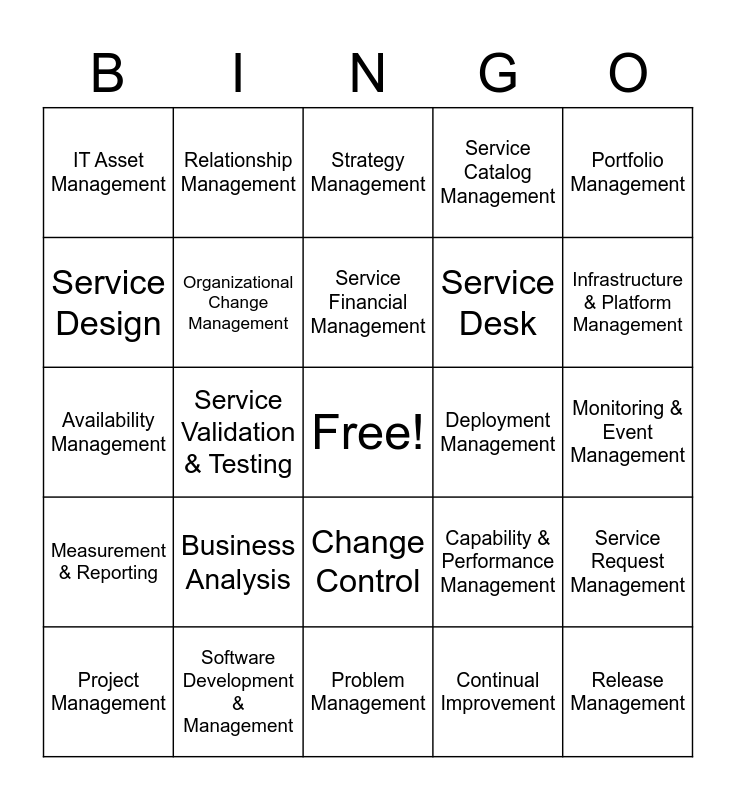 This bingo card has a free space and 34 words: Architecture Management, Continual Improvement, Information Security Management, Knowledge Management, Measurement & Reporting, Organizational Change Management, Portfolio Management, Project Management, Relationship Management, Risk Management, Service Financial Management, Strategy Management, Supplier Management, Workforce & Talent Management, Deployment Management, Infrastructure & Platform Management, Software Development & Management, Availability Management, Business Analysis, Capability & Performance Management, Change Control, Incident Management, IT Asset Management, Monitoring & Event Management, Problem Management, Release Management, Service Catalog Management, Service Configuration Management, Service Desk, Service Design, Service Continuity Management, Service Validation & Testing, Service Request Management and Service Level Management.