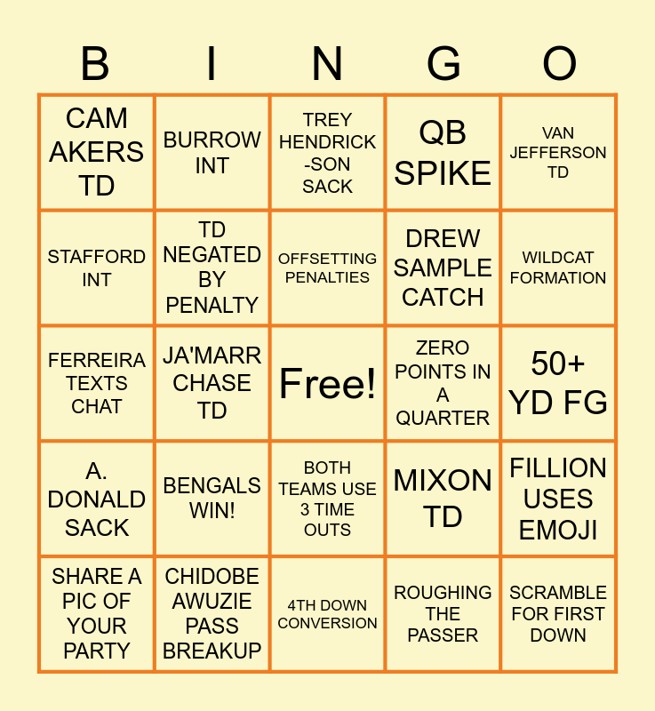 This bingo card has a free space and 24 words: BENGALS WIN!, CHIDOBE AWUZIE PASS BREAKUP, OFFSETTING PENALTIES, SHARE A PIC OF YOUR PARTY, VAN JEFFERSON TD, CAM AKERS TD, STAFFORD INT, BURROW INT, ZERO POINTS IN A QUARTER, BOTH TEAMS USE 3 TIME OUTS, DREW SAMPLE CATCH, FERREIRA TEXTS CHAT, MIXON TD, FILLION USES EMOJI, TD NEGATED BY PENALTY, ROUGHING THE PASSER, 50+ YD FG, TREY HENDRICK -SON SACK, WILDCAT FORMATION, JA'MARR CHASE TD, SCRAMBLE FOR FIRST DOWN, A. DONALD SACK, QB SPIKE and 4TH DOWN CONVERSION.