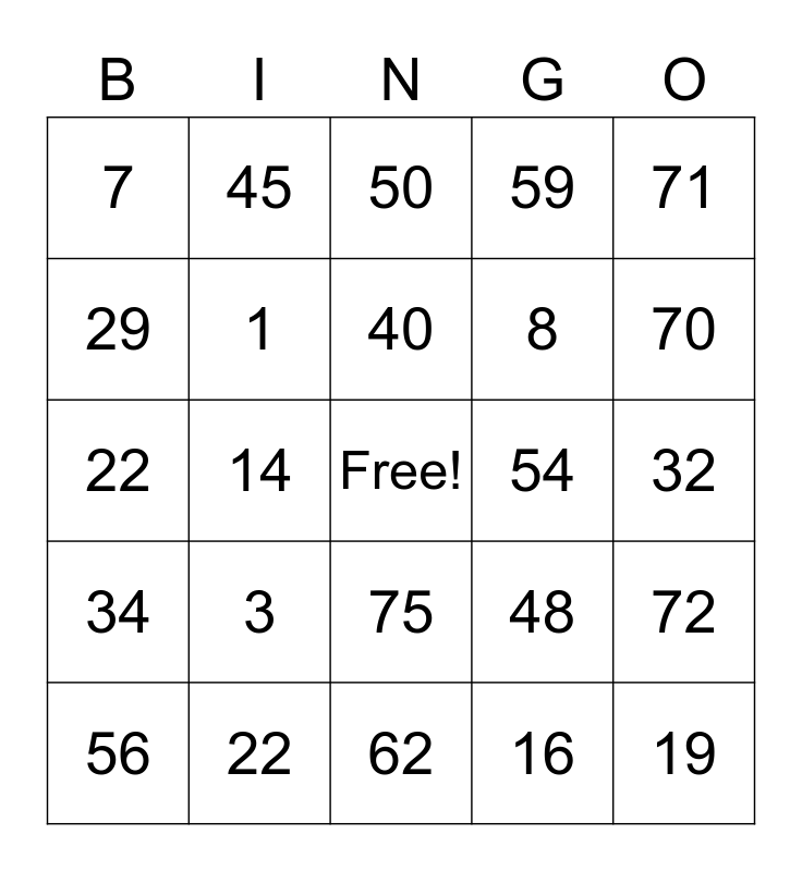 This bingo card has a free space and 24 words: 3, 22, 40, 56, 71, 7, 29, 45, 54, 75, 8, 22, 48, 72, 1, 16, 32, 50, 70, 14, 19, 34, 59 and 62.