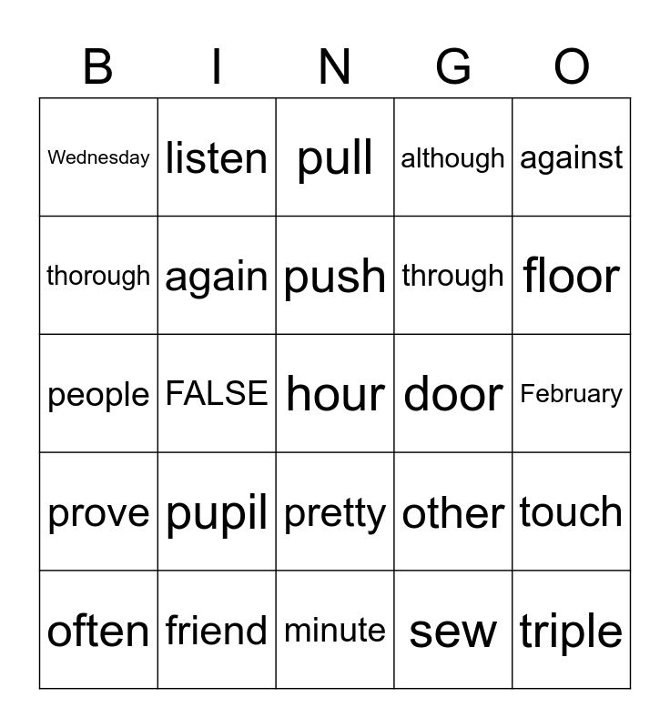 This bingo card has 33 words: triple, among, FALSE, move, prove, again, against, often, listen, put, push, pull, bull, bush, door, floor, friend, people, pupil, other, pretty, laugh, Wednesday, February, minute, hour, although, through, thorough, touch, clothes, sew and because.
