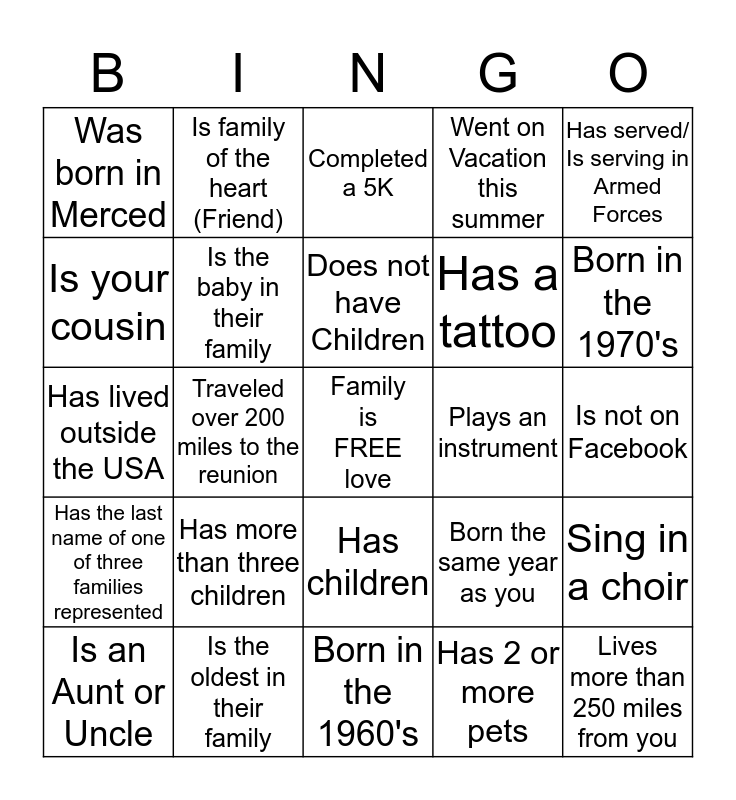 This bingo card has a free space and 40 words: Has a birthday the same month as yours, Has lived outside the USA, Has lived outside California, Is the baby in their family, Is the oldest in their family, Has children, Does not have Children, Is a grandparent, Has served/ Is serving in Armed Forces, Has the last name of one of three families represented, Traveled over 200 miles to the reunion, Went on Vacation this summer, Lives more than 250 miles from you, Is not on Facebook, Plays an instrument, Has more than three children, Plays golf regularly, Was born in Merced, Speaks another language, Completed a 5K, Sing in a choir, Has 2 or more pets, Has a tattoo, Is your cousin, Works in Health Care, Works with children, Works in IT, Is married, Is left handed, Does not live in CA, Likes to fish, Is an Aunt or Uncle, Has been on a cruise, Born the same year as you, Born in the 1970's, Born in the 1960's, Born in the 1980's, Born in the 90's, Is family of the heart (Friend) and Is retired.