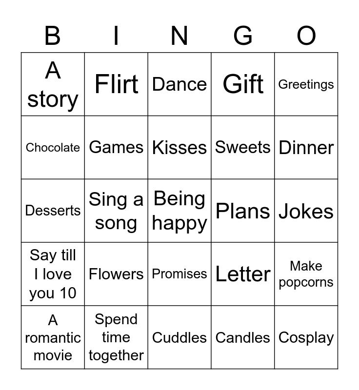 This bingo card has 25 words: Flowers, Cuddles, Kisses, A romantic movie, Greetings, A story, Chocolate, Flirt, Plans, Promises, Sweets, Desserts, Letter, Make popcorns, Games, Cosplay, Jokes, Dance, Dinner, Sing a song, Being happy, Spend time together, Say till I love you 10, Gift and Candles.