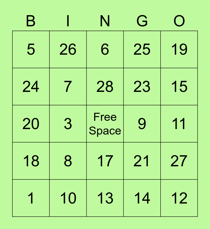 This bingo card has a free space and 29 words: 1, 2, 3, 4, 5, 6, 7, 8, 9, 10, 11, 12, 13, 14, 15, 16, 17, 18, 19, 20, 21, 22, 23, 24, 25, 26, 27, 28 and 29.