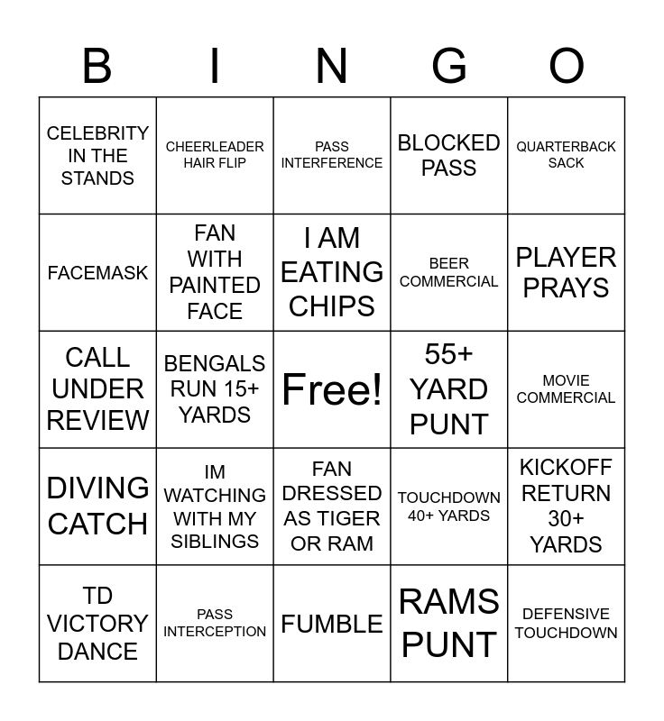 This bingo card has a free space and 27 words: TOUCHDOWN 40+ YARDS, ANY TEAM SCORES 20+ POINTS, BEER COMMERCIAL, FUMBLE, FACEMASK, PASS INTERFERENCE, CHEERLEADER HAIR FLIP, DIVING CATCH, 55+ YARD PUNT, KICKOFF RETURN 30+ YARDS, CALL UNDER REVIEW, BLOCKED PASS, TD VICTORY DANCE, PASS INTERCEPTION, PLAYER PRAYS, SOMEONE MAKES SIGN OF CROSS, FAN WITH PAINTED FACE, I AM EATING CHIPS, IM WATCHING WITH MY SIBLINGS, CELEBRITY IN THE STANDS, MOVIE COMMERCIAL, RAMS PUNT, BENGALS RUN 15+ YARDS, DEFENSIVE TOUCHDOWN, FAN DRESSED AS TIGER OR RAM, QUARTERBACK SACK and FAST FOOD COMMERCIAL.