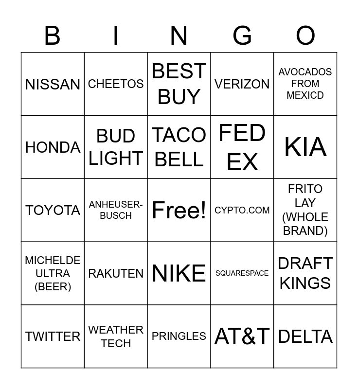This bingo card has a free space and 32 words: AT&T, BUSCH BEER, ANHEUSER-BUSCH, SAMS CLUB, MICHELDE ULTRA (BEER), BUD LIGHT, AVOCADOS FROM MEXICD, DRAFT KINGS, CHEETOS, DORITOS, TACO BELL, BEST BUY, QUICK BOOKS, FTX CYPTO, CYPTO.COM, TURBO TAX, TWITTER, TOYOTA, NIKE, RAKUTEN, SQUARESPACE, META, FRITO LAY (WHOLE BRAND), WEATHER TECH, DELTA, VERIZON, FED EX, HONDA, NISSAN, PRINGLES, GM and KIA.
