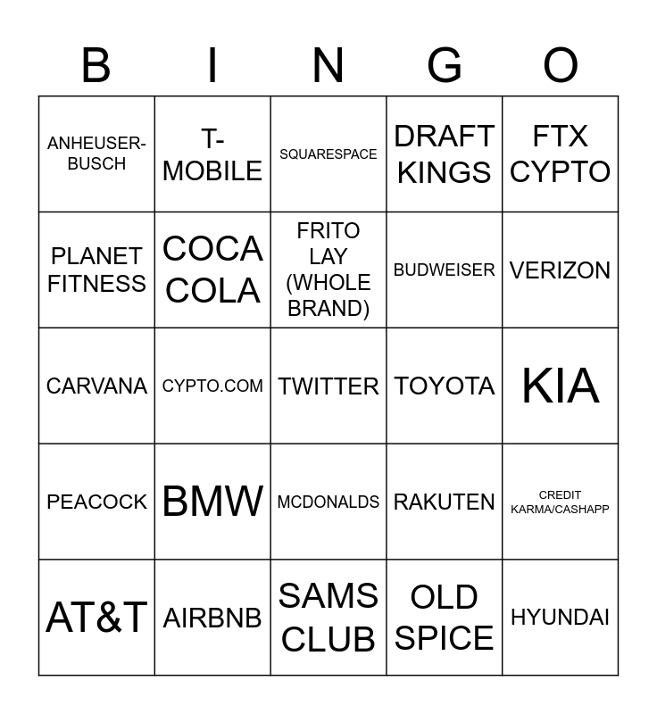 This bingo card has 56 words: Free!, AT&T, BUSCH BEER, ANHEUSER-BUSCH, SAMS CLUB, MICHELOB ULTRA (BEER), COCA COLA, BUD LIGHT, BUDWEISER, AVOCADOS FROM MEXICO, DRAFT KINGS, CHEETOS, DORITOS, TACO BELL, BEST BUY, QUICK BOOKS, FTX CYPTO, CYPTO.COM, TURBO TAX, TWITTER, TOYOTA, NIKE, RAKUTEN, SQUARESPACE, META, FRITO LAY (WHOLE BRAND), WEATHER TECH, DELTA, VERIZON, FED EX, HONDA, NISSAN, PRINGLES, GM, KIA, PLANET FITNESS, CARVANA, CAESARS SPORTSBOOK, PEACOCK, T-MOBILE, MCDONALDS, HYUNDAI, TIDE, UBER EATS, AMAZON, BMW, AIRBNB, VRBO, HOTELS.COM, GOOGLE, OLD SPICE, ROCKET MORTGAGE, SALESFORCE, TURBOTAX, CREDIT KARMA/CASHAPP and NCAA.