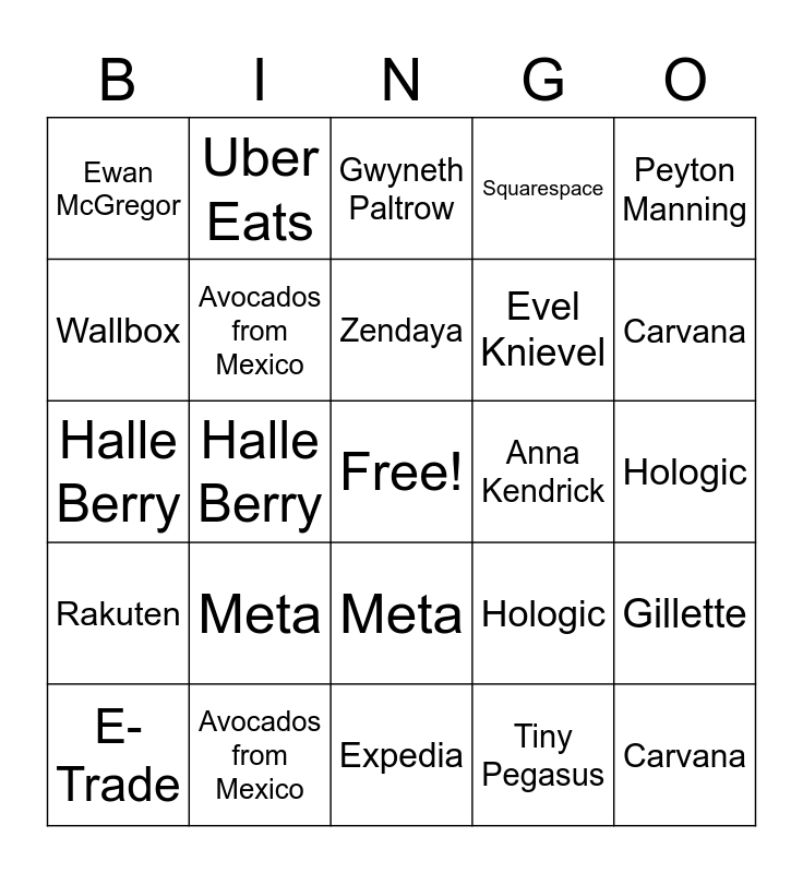This bingo card has a free space and 48 words: BMW, Carvana, E-Trade, Expedia, Meta, Rakuten, Uber Eats, Caesars, Wallbox, Weathertech, Avocados from Mexico, Squarespace, Gillette, Hologic, Draft Kings, Arnold Schwarzenegger, Zendaya, Anna Kendrick, Gwyneth Paltrow, Peyton Manning, Halle Berry, Tiny Pegasus, Ewan McGregor, Evel Knievel, BMW, Carvana, E-Trade, Expedia, Meta, Rakuten, Uber Eats, Caesars, Wallbox, Weathertech, Avocados from Mexico, Squarespace, Gillette, Hologic, Draft Kings, Arnold Schwarzenegger, Zendaya, Anna Kendrick, Gwyneth Paltrow, Peyton Manning, Halle Berry, Tiny Pegasus, Ewan McGregor and Evel Knievel.